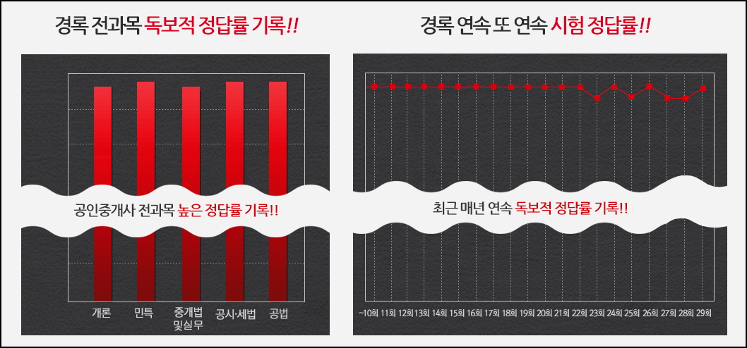 공인중개사시험으로 유명한 경록의 경우 개론을 포함한 민특, 중개법 및 실무, 공시, 세법, 공법 등 전과목에 걸쳐 높은 정답률을 기록하고 있습니다.