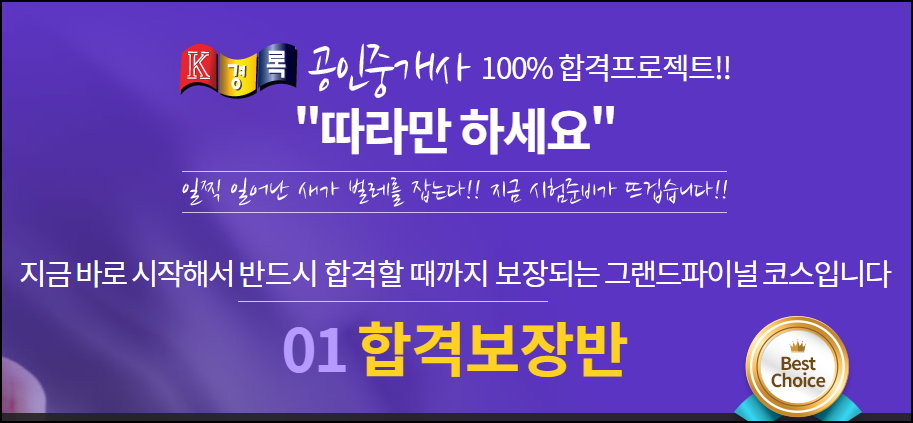 최근 직장 생활을 하는 분들 중에서도 많은 분들이 자격증 공부를 하고 계신데요. 그 중 가장 인기 있는 자격증 중 하나가 공인중개사입니다. 다만, 예전과 달리 시험을 준비하는 수험생도 많아지고 문제 수준도 올라간 만큼, 보다 확실한 곳에서 준비하는 게 중요한데요. 60년 전통의 경록 공인중개사시험으로 보다 쉽게 준비해보세요.