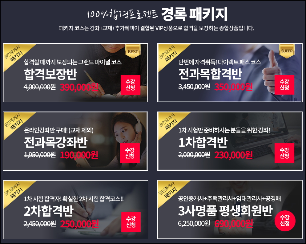 공인중개사인강으로 많은 분들이 추천하시는 경록에서는 다양한 패키지를 마련해두고 있는데요. 합격보장반을 비롯한 전과목합격반, 전과목강좌반, 1차 및 2차 합격반 등을 대단히 합리적인 금액으로 수강하실 수 있습니다.